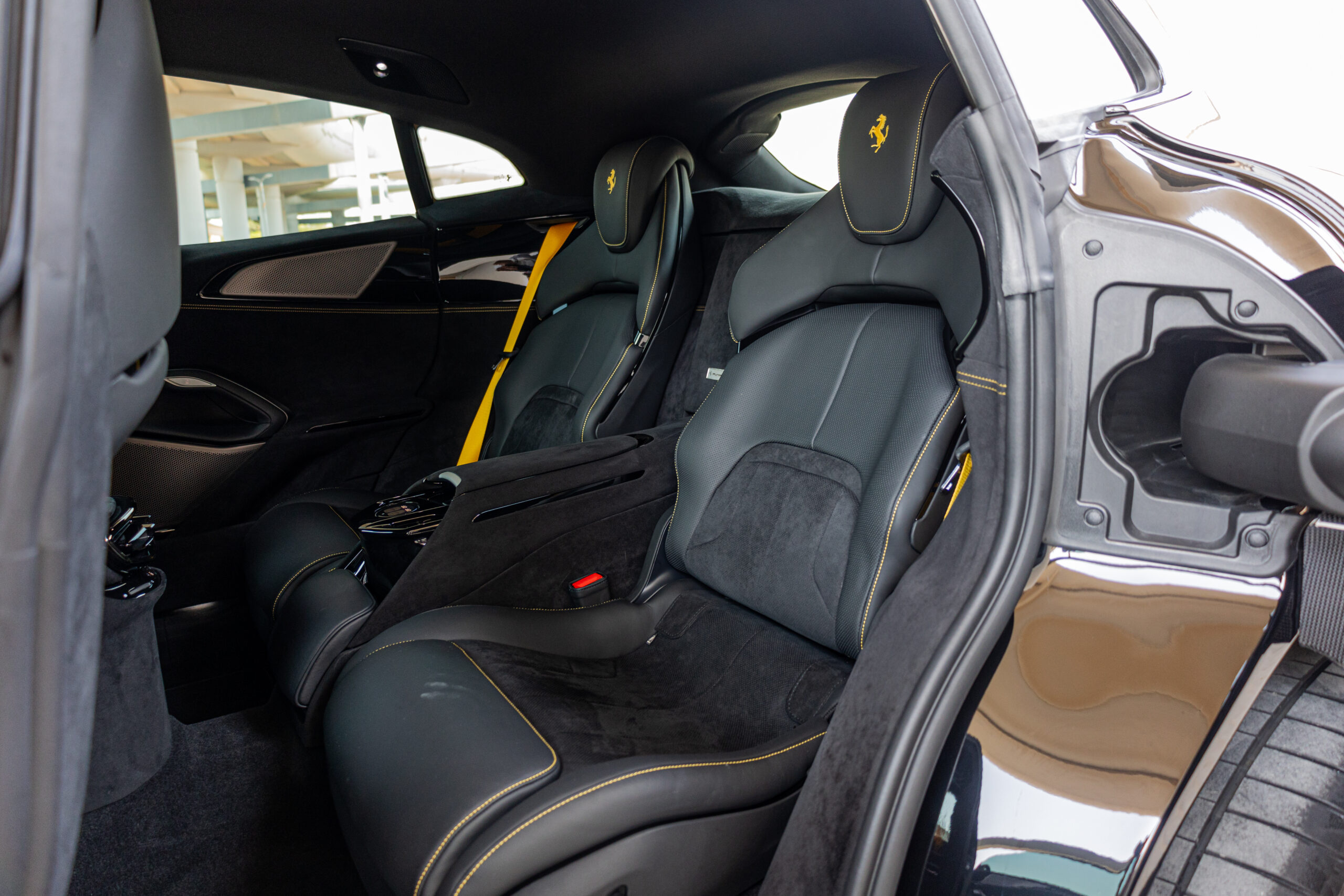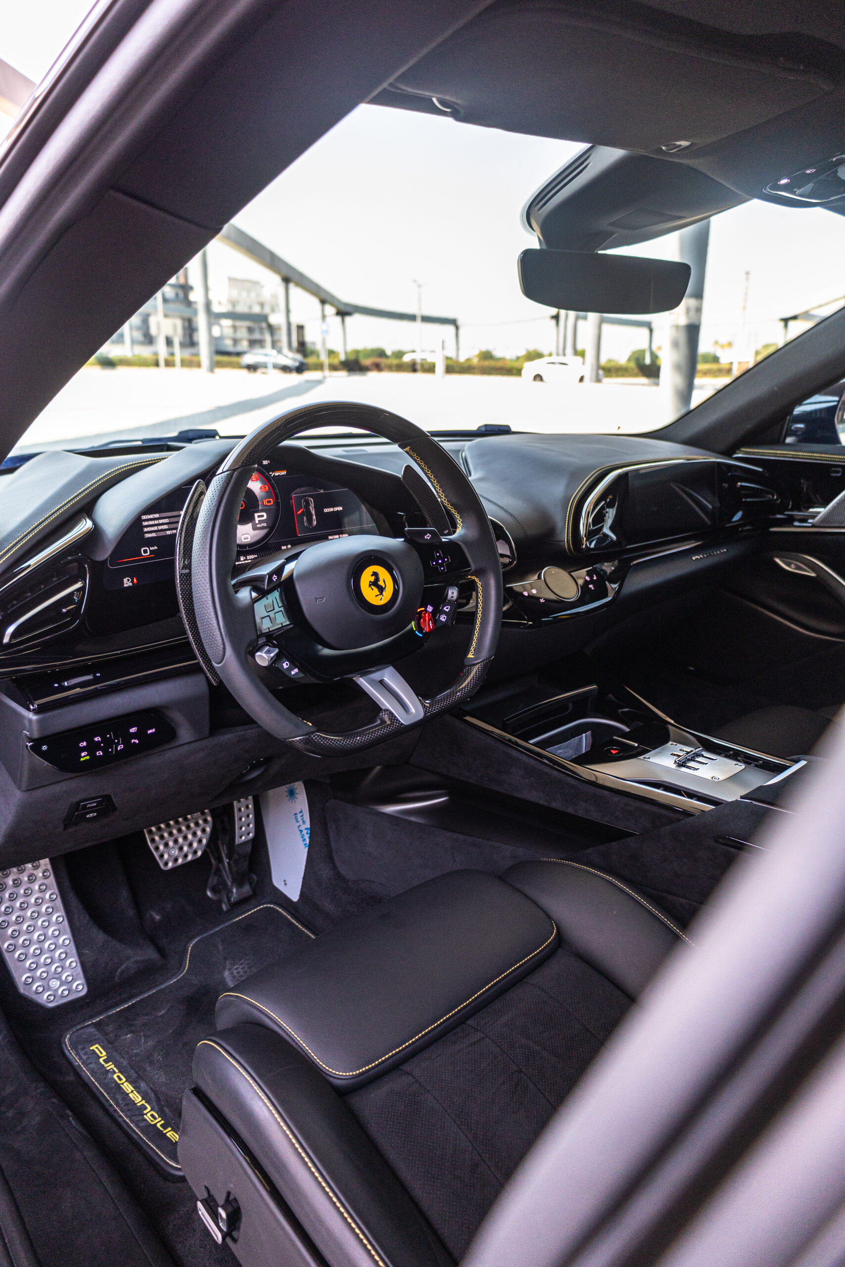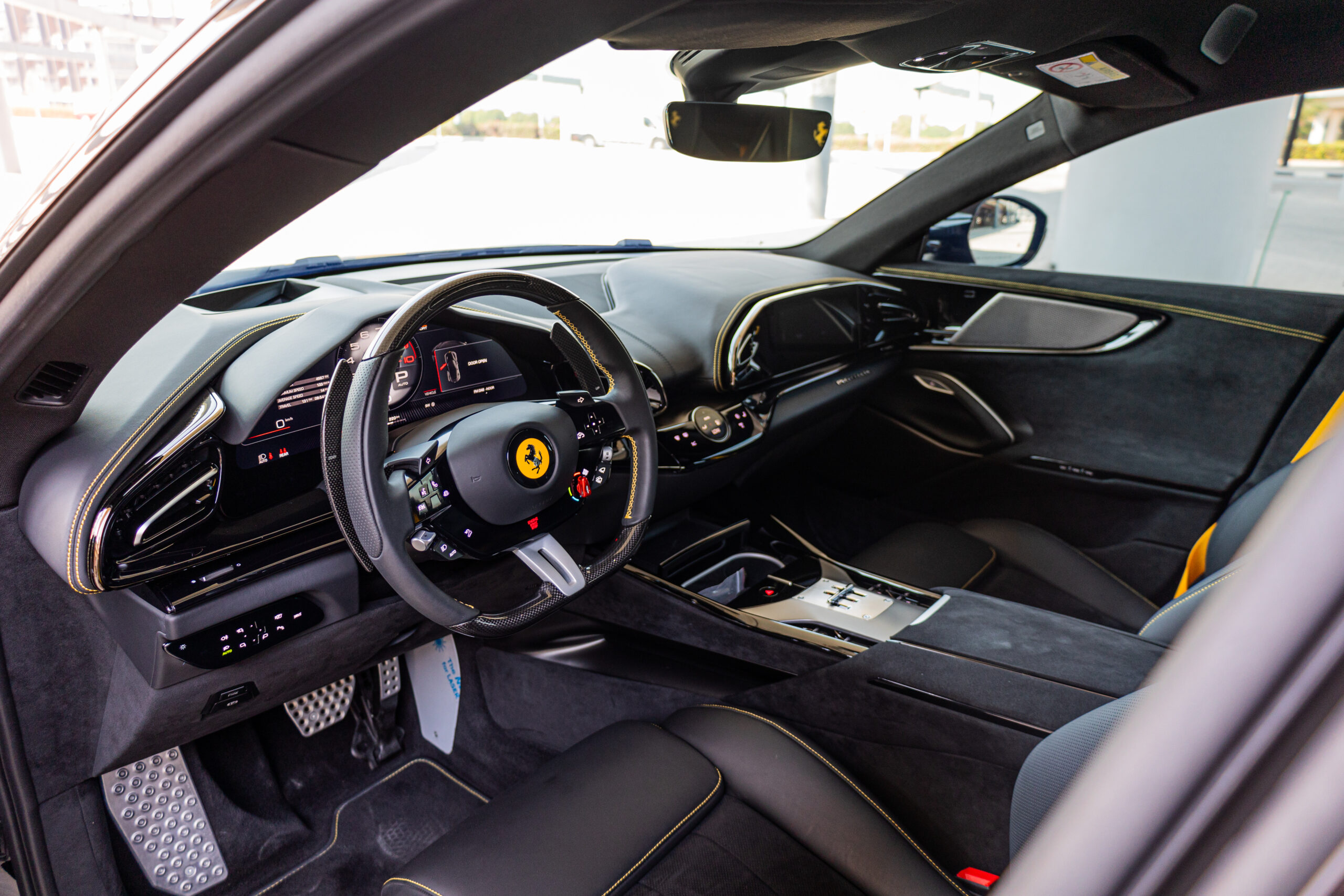 Inside, the cabin offers a futuristic and luxurious environment. With four individual seats, premium leather and Alcantara materials, and dual digital displays for both driver and passenger, the Purosangue delivers comfort without compromising its sporty character.