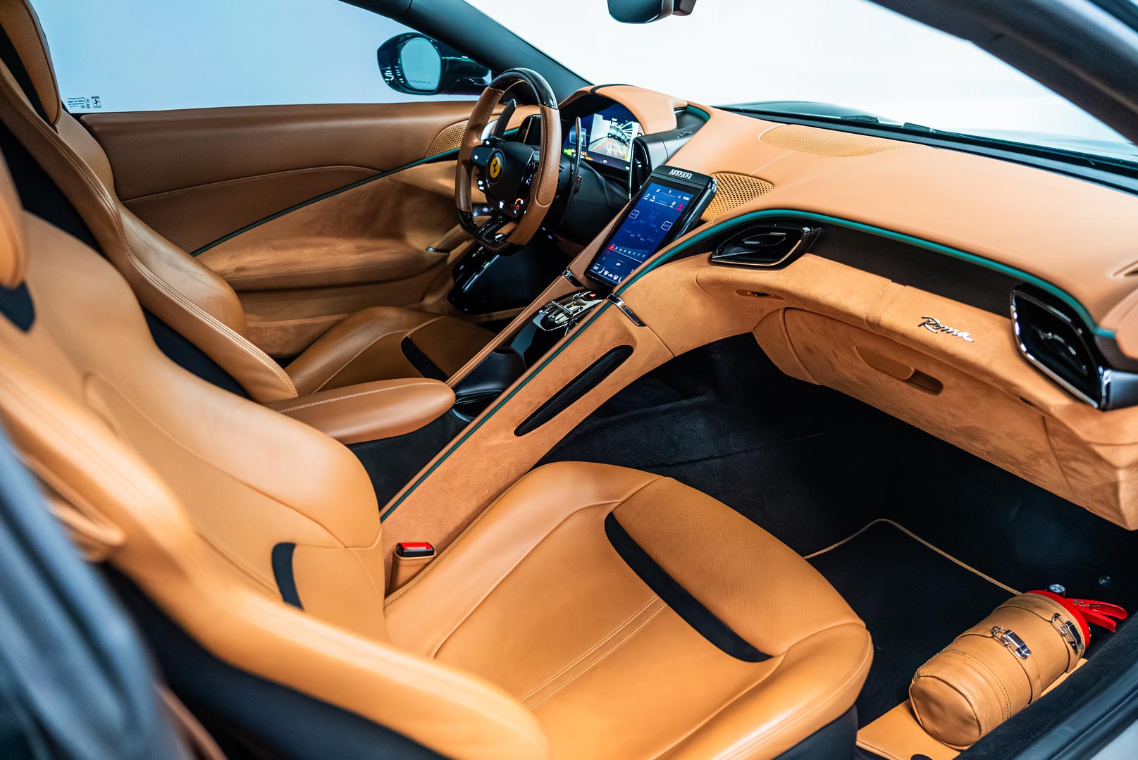 Inside, the Ferrari Roma offers a premium 2+2 seating layout with a driver-focused cockpit and high-quality leather finishes throughout the cabin. The dual-screen digital interface separates driver controls and infotainment, creating a futuristic yet luxurious experience. Every detail is designed to maximize comfort while keeping the driving experience engaging and intuitive.